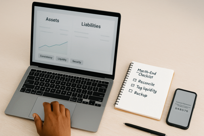- Standardize sources. Decide, for example, “use closing prices from the same broker; use online statement balances for bank/credit.”