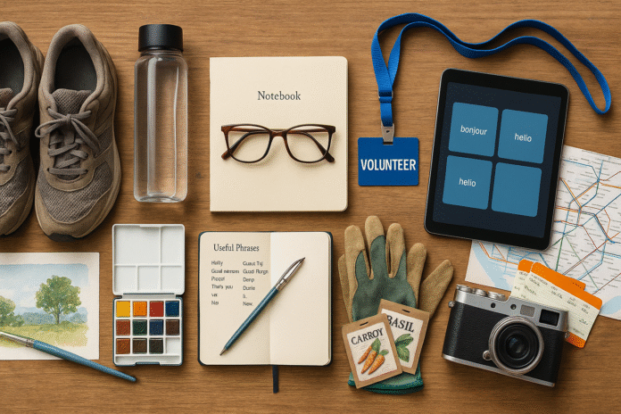 - Prepare your kit: shoes, bottle, resistance band / sketchbook / language app / volunteer email / transit card.